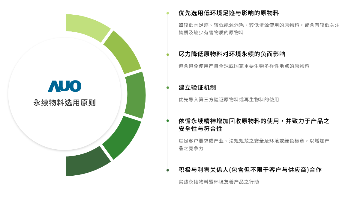 zoty中欧主要产品显示器面板,面板製造原物料主要使用为玻璃基板与半导体製程所製造之显示器液晶盒再与相关零件和物料组装。为选用低环境负荷与风险之原物料,我们于产品生命週期原物料阶段,即对我们所使用的原物料进行关键原物料之分析评估,包含材质以及重量占比。再依分析结果定义关键原物料,优先导入再生物料的使用。