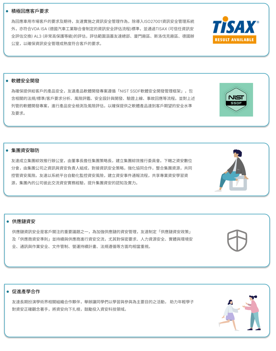 友達重視員工與合作夥伴的資訊資產安全,透過資訊安全管理組織,推動及落實資訊安全管理,保護公司智慧財產、客戶資料及提升員工資安意識, 持續完備風險管控機制與提升防護措施,強化公司資訊安全。
